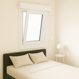 Fenêtre PVC à oscillo-battant, avec volet roulant intégré en PVC électrique filaire. Fenêtre double vitrage + intercalaires Warm Edge pour une isolation renforcée. Prévu pour pose en applique, attention aux dimensions hors tout (voir photo ou descriptif technique).