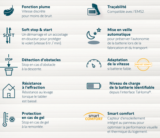 Profitez de la technologie SOMFY solar io RS100 et facilitez-vous la vie au quotidien ! Sa motorisation très silencieuse avec détection d'obstacle est totalement autonome grâce au panneau solaire qui s'alimente par la lumière du jour.