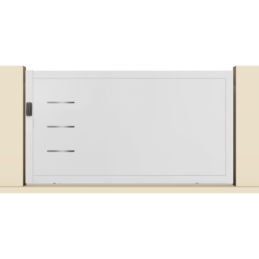 Portail coulissant manuel en PVC, modèle BRIANCON, au style plein à coupe droite avec inserts en inox. Sa structure est renforcée en ALU pour plus de robustesse, et vous permet d'y ajouter une motorisation à votre guise dans un second temps. Sa hauteur est de 160 cm. Inoxydable, ce portail coulissant en PVC blanc résiste aux pluies, grêles, neiges, UV et à l'air marin. Le PVC nécessite peu d'entretien et permet de sécuriser votre habitation de manière esthétique.